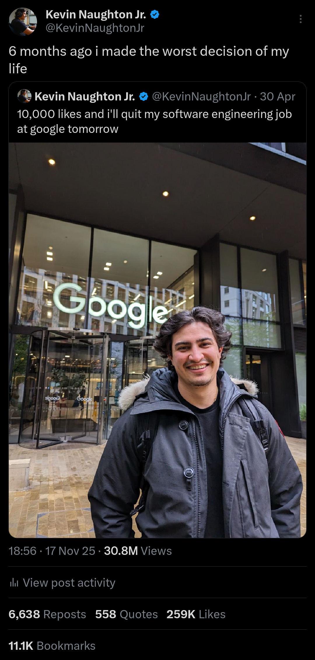 6 Months ago I left my software engineering job at Google to pursue my dream of working for myself. Recently, I posted this on X as a joke that many people obviously believed. Since leaving Google, here’s a few things I’ve learned about self-employment.