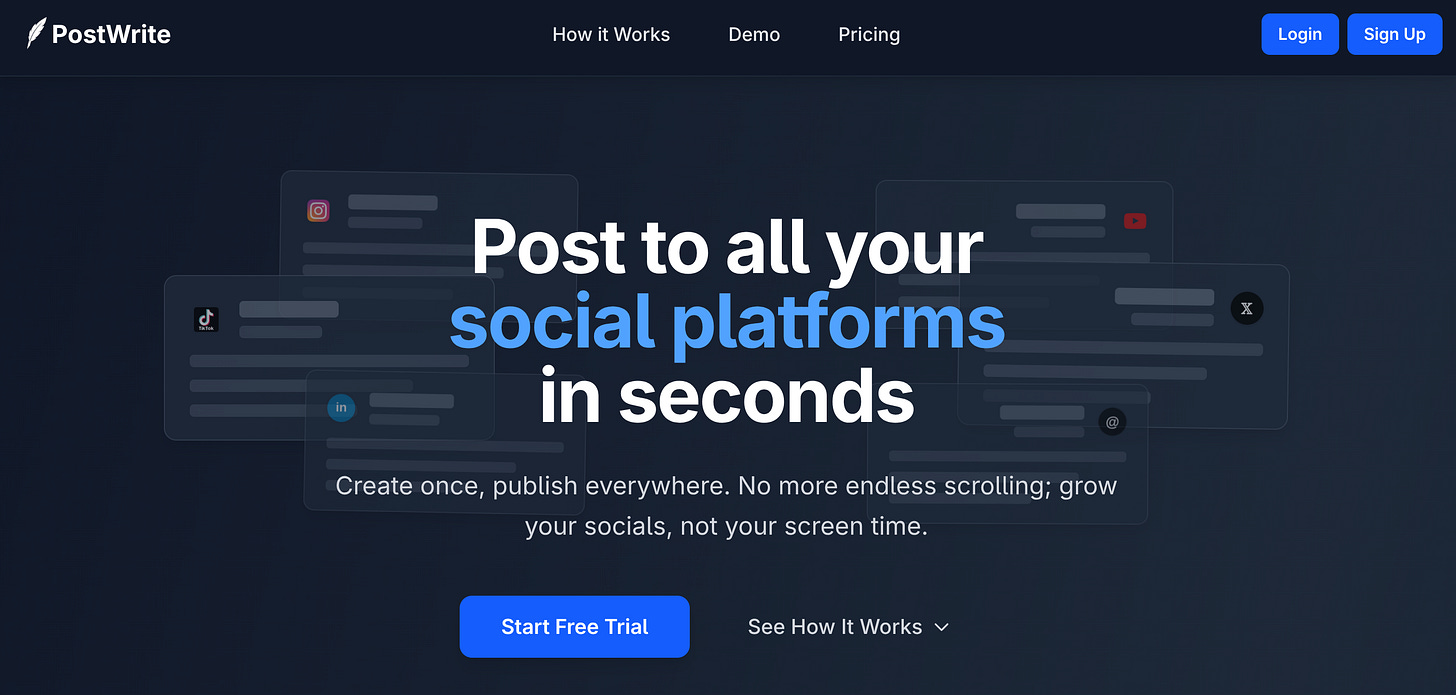 I built Postwrite to help myself post on all my socials easily and quickly without getting sucked into consuming content. It’s helped me create content and continue to grow my audiences without the stress and I think it can do the same for you.