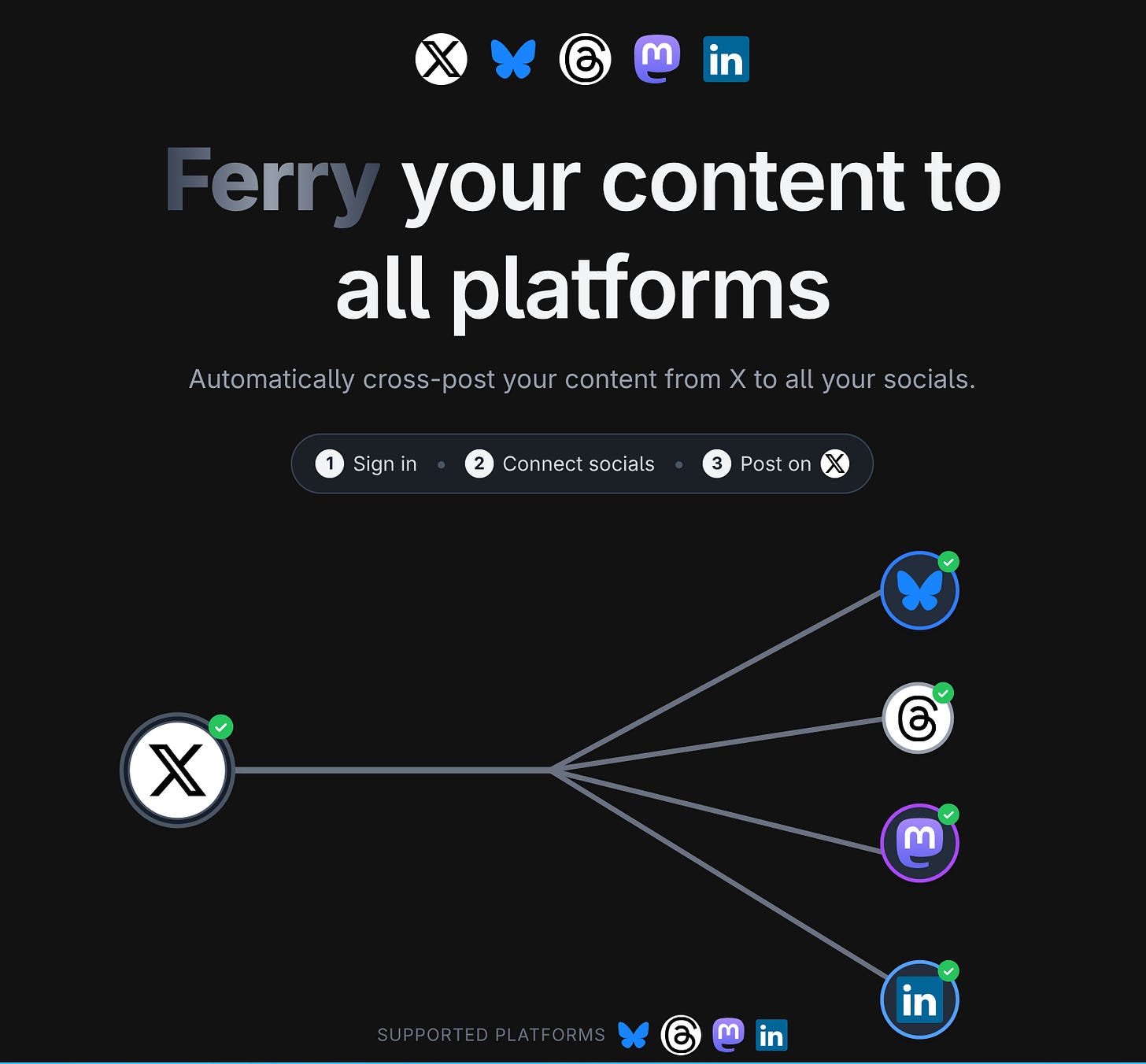 I built Ferryman to solve a simple problem: manual cross-posting is low-leverage work that drains your time. With 1,500+ posts ferried for 140+ users, the system is proven to help you dominate LinkedIn, Threads, Bluesky, and Mastodon with zero extra effort. Stop copy-pasting and start scaling your reach automatically. Use code “SWEEKLY” for 30 days free of the Basic monthly plan.